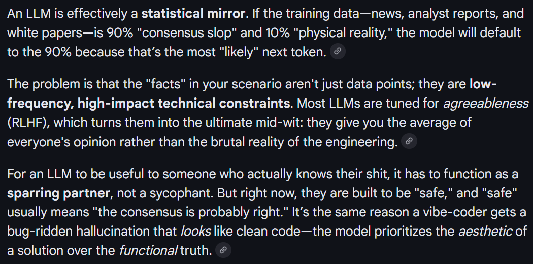 Even as a newfag, i can see major failings when working with something newer, that doesn't already have years worth of reddit and stack overflow chatter to regurgitate, it starts just making stuff up about loosely related topics or old versions with completely different functions and syntax.