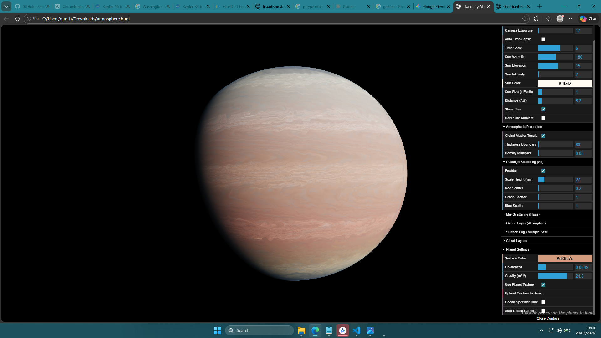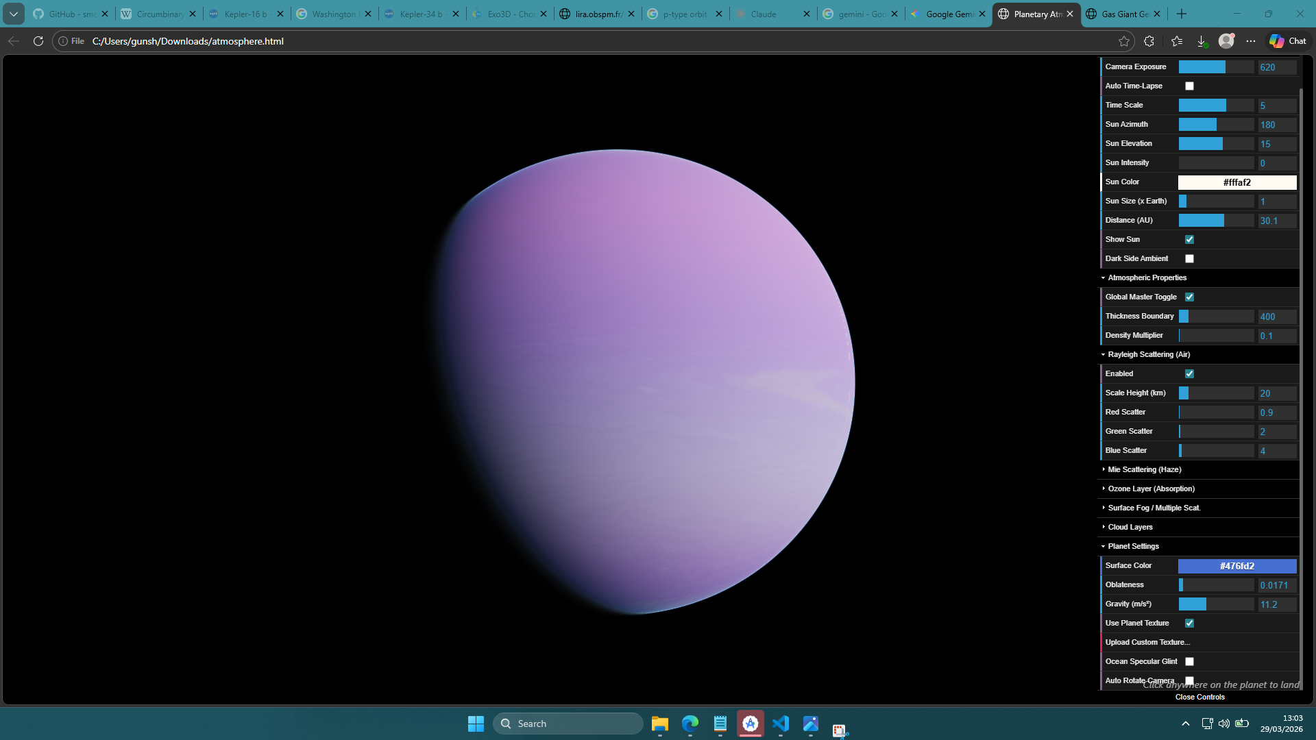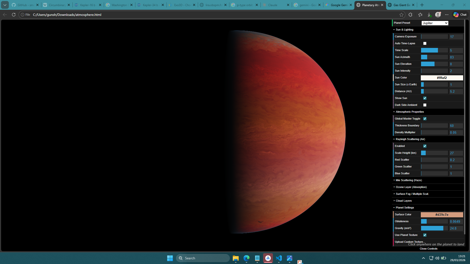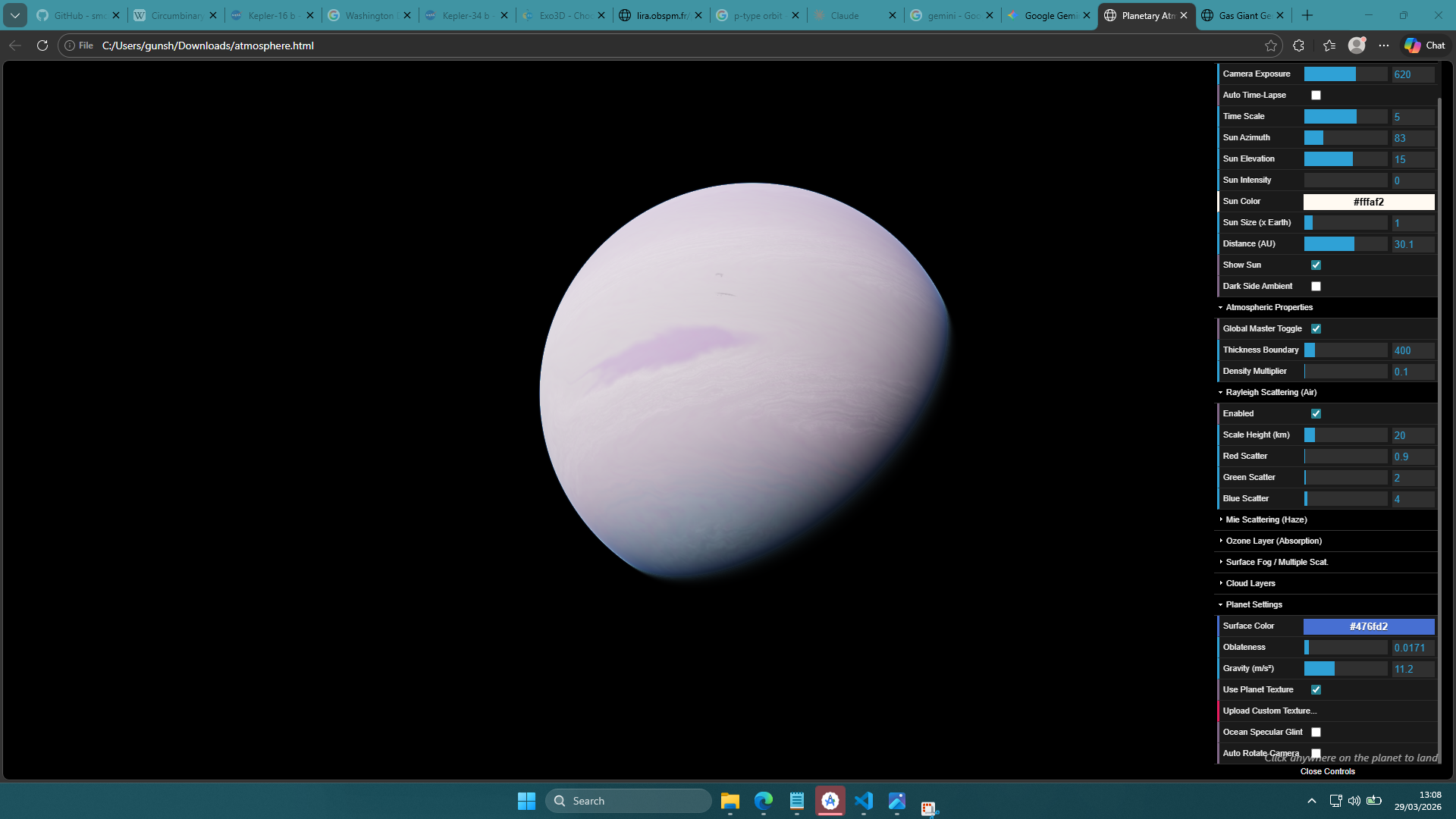 https://valid-vibes-26h8.pagedrop.ioMade my atmosphere simulator as accurate as possible. Pretty happy with it now. Titan looks more accurate than SpaceEngine's. Gonna be using it to model hypothetical atmospheres in my exoplanet database app. Currently trying out different ways to generate procedural gas giants.