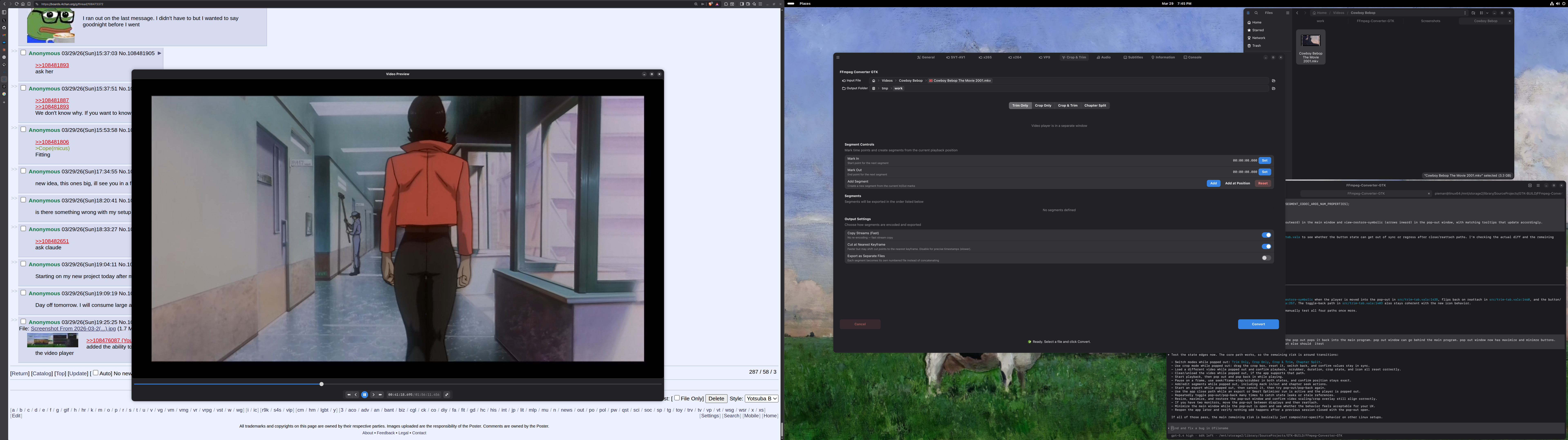 >>108479210You think I'm paying? Lmao. I spent all day adding mozjpeg support to 4chan-xt to improve recompression of unsupported or oversized images. I also implemented a privacy mode to make sure images posted when it is enabled will have randomized MD5s. I did this using GPT-5.4 xhigh with repeated handoffs.