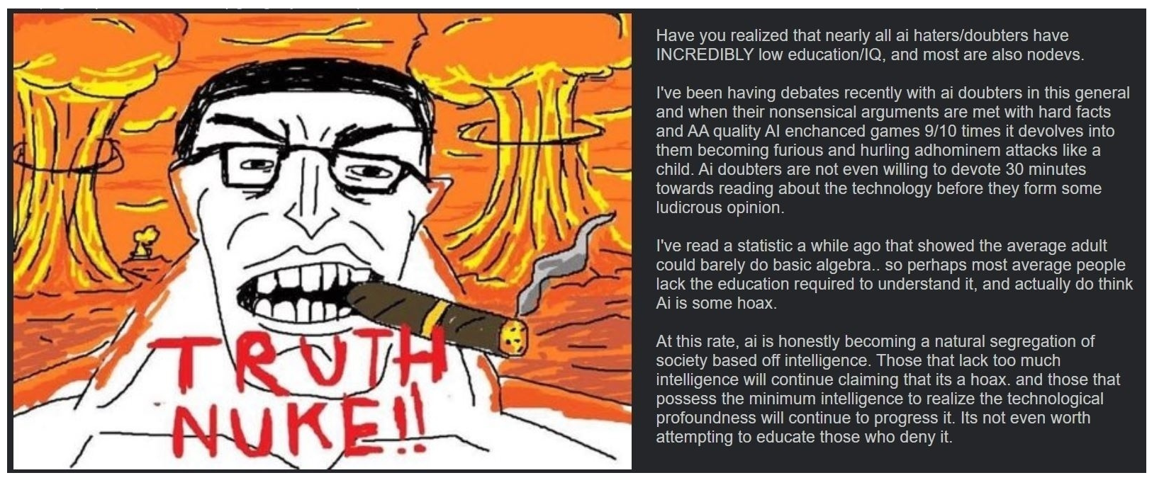 >I know jackshit about coding and can only give somewhat coherent directions to statistical text prediction machines>oh and I'm gonna whine and piss myself when someone calls me out on the fact I'm an unskilled loserClassic vibe koshers.