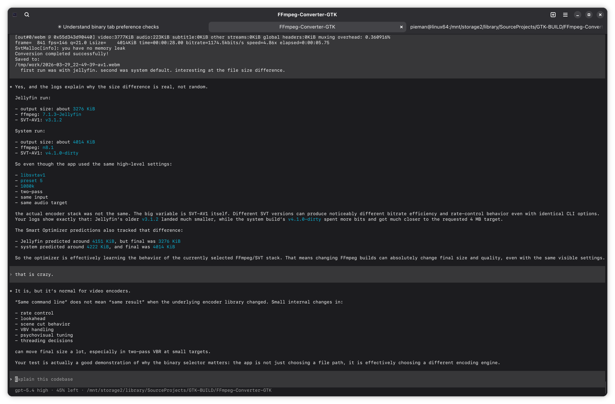 >>108483009did some work before bed to make it ffmpeg fork friendly. pic related is the reason why. pretty crazy how even if the settings are the same, the output can be drastically different. >>108483334fine, not this coming release but the next one ill put in some anime hot babe as an easter egg. probably be rukia kuchiki because shes my waifu.