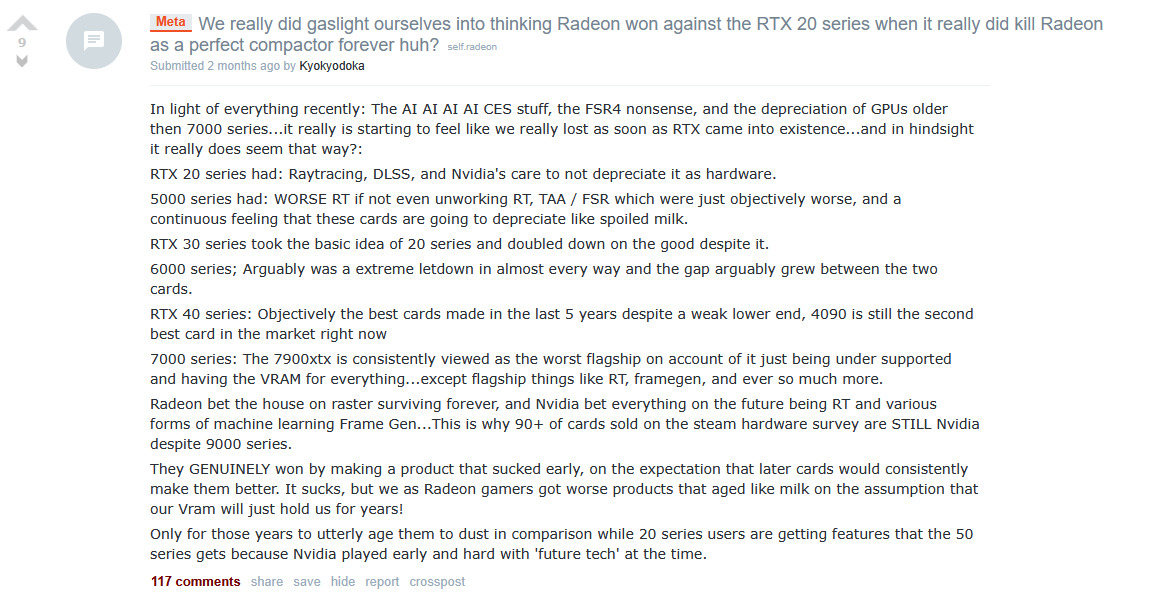 >>108474143 This was meant for >>108474137>>108474152I'm not a schizo, I'm legitimately dealing with AM5 issues and venting. AMD on the GPU side has shown that it will not support your cards, the same people that bought the RX 7000 series and got rugpulled, 6000 the same, meanwhilst the RTX 2000 series is still getting drivers and DLSS updates.It's just common sense, I legitimately was going to pull the trigger on a RX 9070 XT until I saw RTX 4080s for the same price at which DLSS and muh features are just a better value.