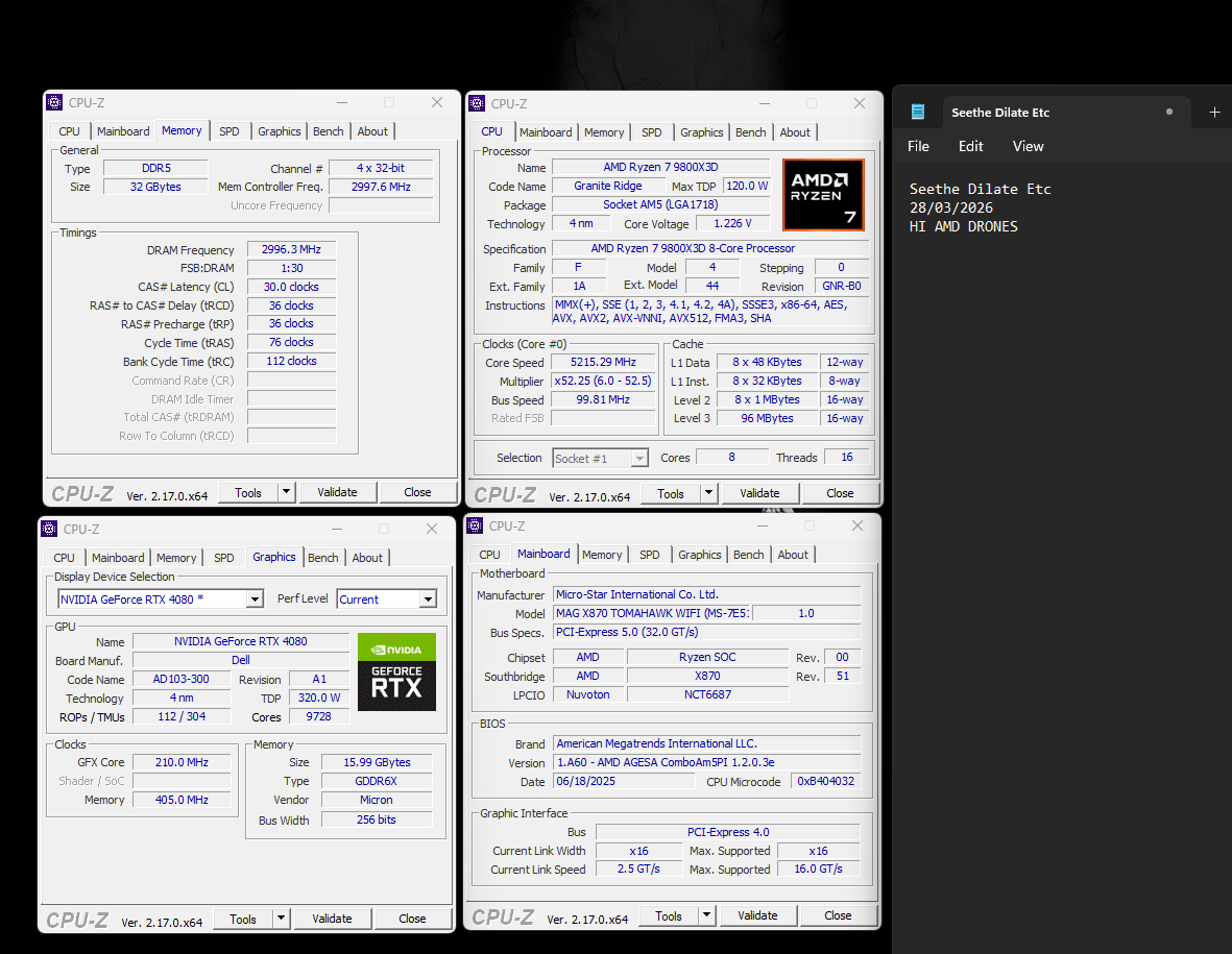 >>108474315In that case, I got my 9800X3D for RPCS3 too, I'd upgrade the 7600x to a 9600x as it has AVX-512 support which is really important for PS3 emulation.For the record, I'm not saying that you should avoid a 9700XT entirely either, just that, if you can get a 16GB RTX 4080 for the same price USED, then grab that as they're about the same in raster with more features and a way stronger chance AMD will kill the card in the cradle.Otherwise you'll have to grab optiscaler, fucking mod FS4 to FS4 from DLSS calls, when quite frankly it's less work and a better result just to grab Nvidia and flip the DLSS magic button.I wouldn't go with a 12gb card unless you were on a significantly lower budget, at which point the B580 would be the obvious pick.