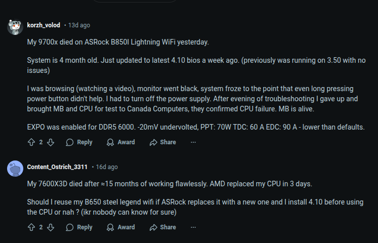 my issues with am5 (9800x3d) after using it for a year1. dogshit memory training thing2. 8 cores lol, stuff starts stuttering when i have too much open3. usb disconnect/reconnect sounds randomly (i know i'm not the only one)4. it's boring. most things just work. there's no real performance to get by overclocking like on an intel system