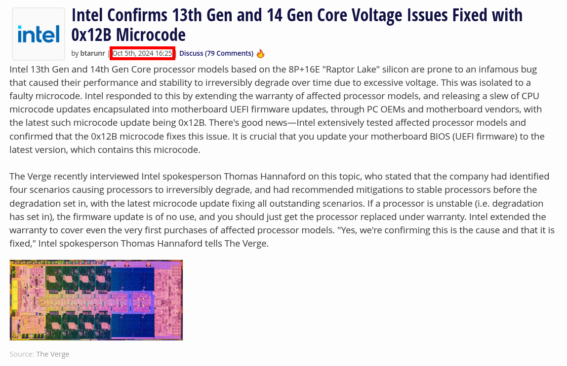 >>1084796290x12F is not a degradation fixit fixes issues with the voltage going too low, not too highbut that update came out a year ago so my point still stands>so who knows if it's really truly fixedintel would know, and they're still selling brand new 14th gen CPUs in stores, with extended 5 year warranties