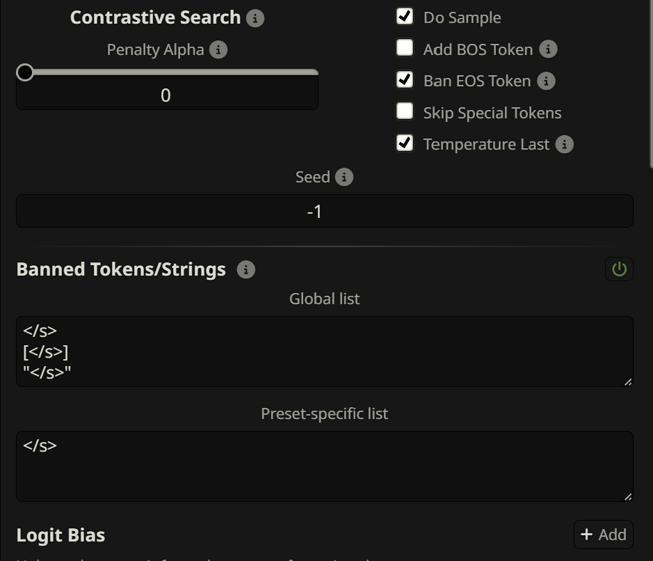 >>108476750Don't use banned tokens it's waste of time and compute. </s> is part of Mistral chat template, you need to edit the char template if you want to get rid of that. I don't use retard tavern anymore but it's on other page.Why would you even want to do this? I don't know.