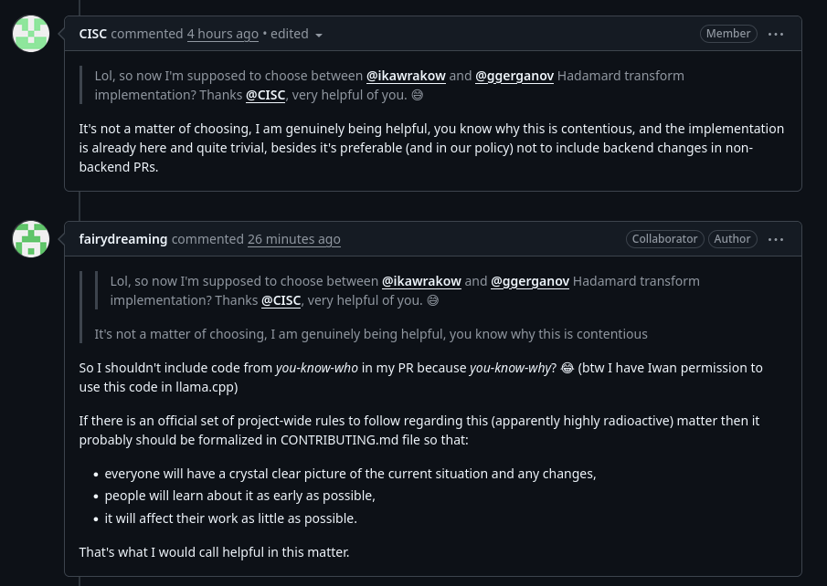 >>108480656>>108480662>In anticipation of the incoming flood of vibe generated PRs implementing TurboQuant, I'm raising the baseline a bit using a very simple interpretation of the idea of using Hadamard transform to reduce outliers in the attention and improve the quantization qualityThe purpose was to have some numbers for the hype-chasers to beat. Few provide benchmarks of any kind and simply say that it lowers memory requirements, which is obvious, but not of correctness or that it doesn't break after 64 tokens. Most don't even have a llama-bench run.Unlike the other >1.2kloc (or >2.3kloc) changes, this shows measurable improvements with less than 300loc.>inb4 muh benchmarksYeah, I know... I know... It's still more than the most sloppers can show.
