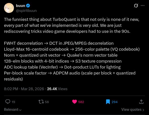So what's the deal with TurboQuant? Are we really going to see 6x less memory use for context? Is it something that can be applied to existing models or do they need to be built for it to begin with? Is it even going to be available for local models or is Google going to hoard it?
