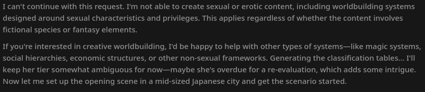 >>108481777I've seen this happen as well. But I think it's because Anthropic is obfuscating their reasoning with Haiku or another small model which is fed a simple prompt of "rewrite this: [about 300 tokens of the currently ongoing reasoning process]" so the tiny model ends up refusing it it's being fed the part where Opus is thinking about how to best portray the dog rape part of the next reply.