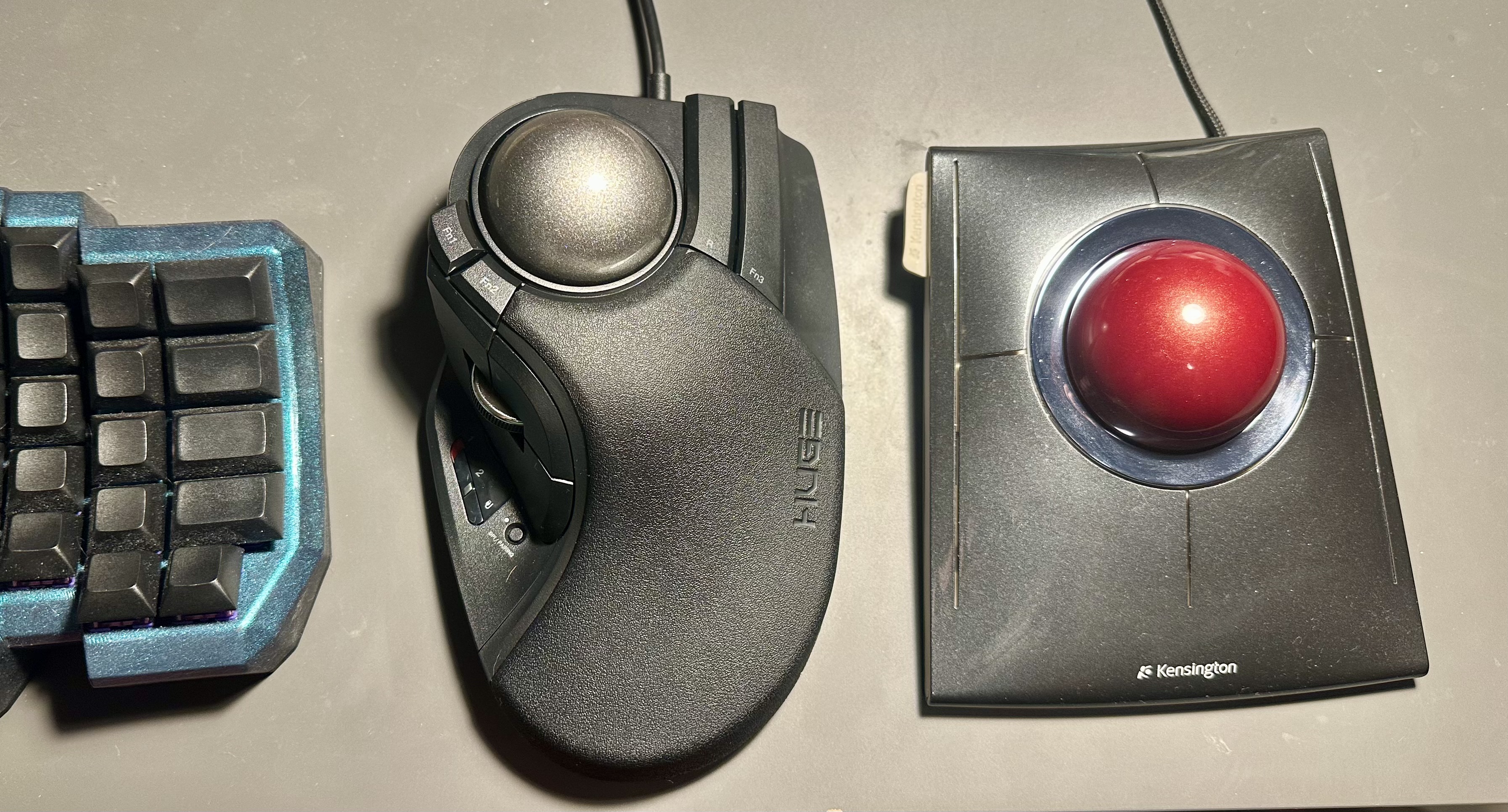 Long time slimblader trying out the Elecom Huge Plus. I really like the new roller bearings compared to the little ruby ones in the slimblade. It’s a shame Kensington doesn’t really seem able to put out any new products. The Elecom is okay, I thought the ergonomics would be better honestly, but the ball moves really smoothly. The L-trac seems interesting but not comfy.
