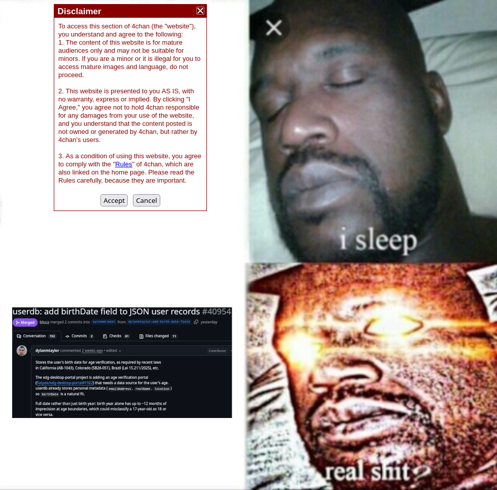 >>108480614This would be true if it's just setting an age that requires root access or a parental controls password to modify. So I'm not necessarily against it on Linux in its current form. But you know what they really want is for everyone to submit all their info to a Palantir-associated company to set it.