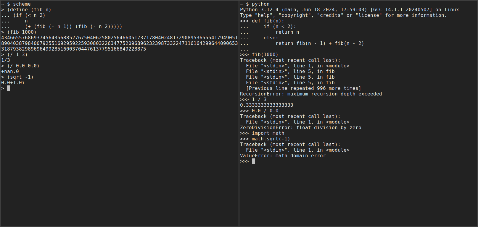 >>108488389>recursionpython is not designed around it but you can up that 1k limit to whatever you want using sys.something iirc, the actual flaw is speed and bloat the recursion limit is a workaround that not a flaw on itself>0/0, sqrt(-1)that's why try except is for, implicit type casting on a weakly typed language is stupid, both functions are meant to return floats and do exactly that