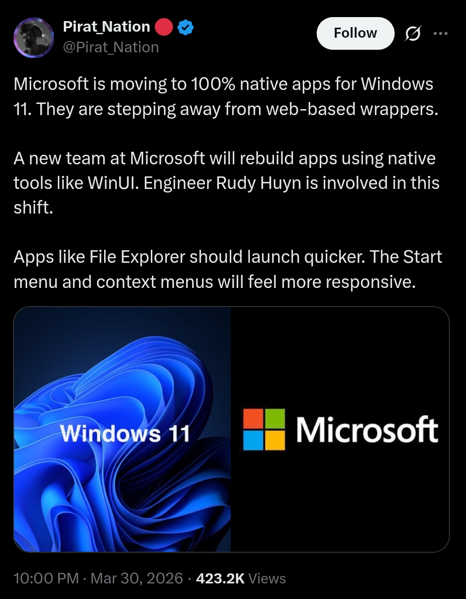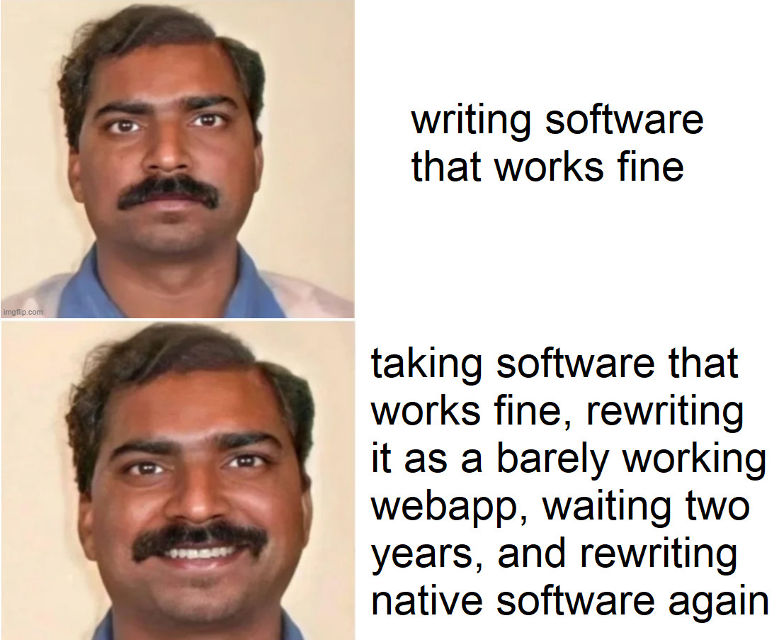 They move to web platform tech, which can be just as good as “native,” but they put shitty engineers on it and it ends up a disaster. Now they need to spend more money to implement a more niche and expensive tech (WinUI). A decades-old tale at this point.