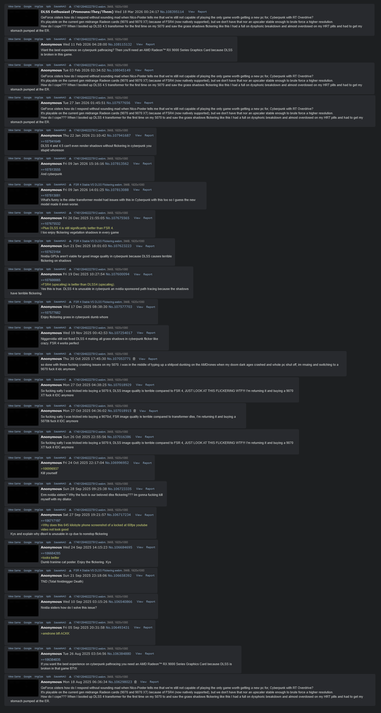 >108491914>b-but it's f-fixed!!! The cry of the nvidijeet. WEBM related is what DLSS 4 and 4.5 looks like on CP 2077 still never fixed and never will be