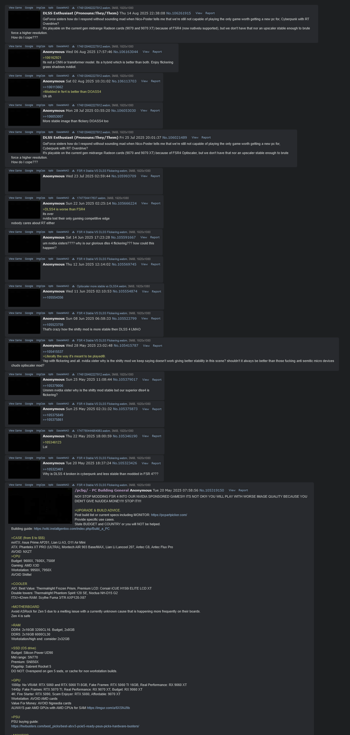 Yes saar I builted my PC with Nvidia JeetForce 5080 graphics device and Cow Dung Ultra 270k processor how you know?>UPGRADE & BUILD ADVICE.Post build list or current specs including MONITOR: https://pcpartpicker.com/Provide specific use cases.State BUDGET and COUNTRY or you will NOT be helped.Building guide: https://wiki.installgentoo.com/index.php/Build_a_PC>CASEmATX: AP201, Lian Li A3, O11 Air Mini, XT M3, CH260ATX: XT PRO (ULTRA), AIR 903 Base/MAX, Lancool 217, Flux Pro, Y40, Meshify 3, 4000D FRAMEDual Chamber: Y60/70, Vision (Compact), Antec C8AVOID: NXZT, 'Silent' cases, fanless cases, Corsair 6500>CPUBudget: 9600X, 7600X, 7500FGaming: AMD X3DWorkstation: 9950X, 9900XAVOID Shittel>COOLERAIO: Best Value: Thermalright Frozen Edge, Premium: Lian Li GA II Lite, LCD: TRYX PanoramaDouble towers: Thermalright Phantom Spirit 120 SE, Noctua NH-D15 G2>MOTHERBOARDAvoid ASRock AM5 boards, CPU degradation issues still reported.>RAMGaming: DDR5 2x16GB 6000CL30Workstation/high end: consider 2x32GB>SSD (OS drive)Budget: NM790Mid range: SN7100Premium: SN850XFlagship: SN8100>GPU1080p: RX 9060 XT 16GB, Poorfag Esports Gaming: Used GPU between $100-$2501440p: RX 9070 XT, RX 9070, Budget: RX 9060 XT 16GB4K: RX 9070 XTWorkstation: Radeon AI PRO R9700, CUDA Mandatory: Used RTX 4090 or RTX 3090 tiAVOID RTX 50 Series: False advertising "5070=4090 performance!!", unsafe power connector, broken drivers, overpriced compared to RDNA 4 in most regions, threatening reviewers, manipulating and faking reviews, destroying game art direction with AI slop etc.ALWAYS pair AMD GPUs with AMD CPUs for SAM https://imgur.com/a/6XSNJ9b>PSUhttps://hwbusters.com/best_picks/best-atxv3-pcie5-ready-psus-picks-hardware-busters/>MONITORhttps://www.rtings.com/monitor>CASE FANSMeta: Case with good stock PWM fansMid range: Arctic P12/P14 (Max) (5-pack)High end: Noctua NF-A12x25, Noctua NF-A14x25 G2Prev: >>108482063