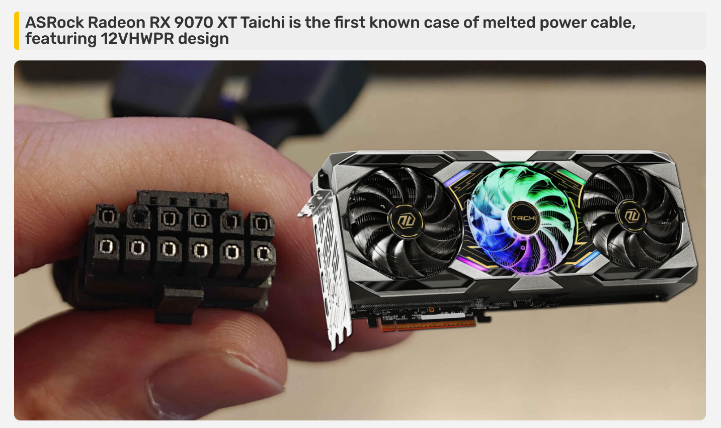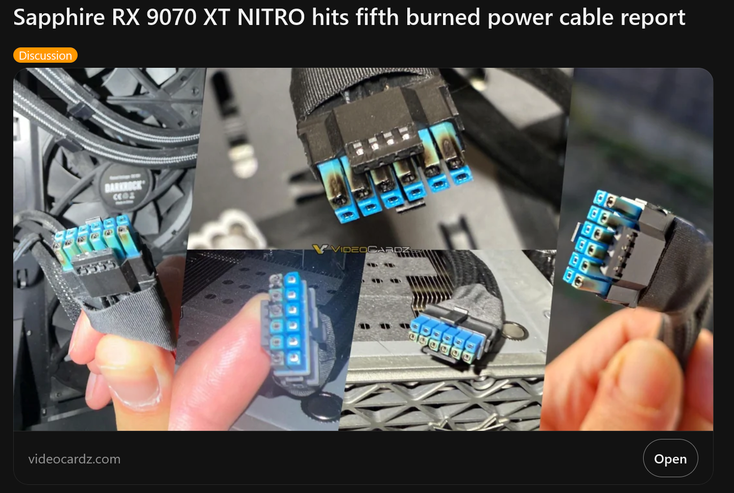 It just keeps happening...https://videocardz.com/newz/sapphire-rx-9070-xt-nitro-hits-fifth-burned-power-cable-report