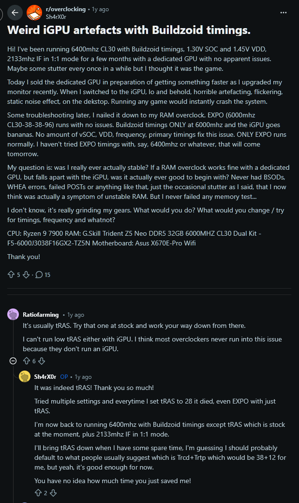 >>108492623You're blinded by your hatred retard I hadn't even changed any timings from the EXPO and was just trying to raise frequency per buildzoids advice to raise vsoc for higher mclk. In my post even I said I thought it was probably something with timings