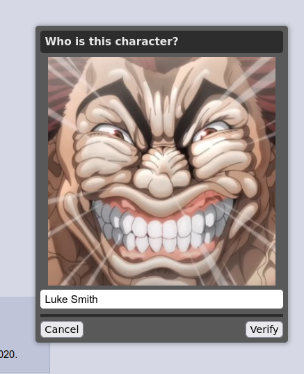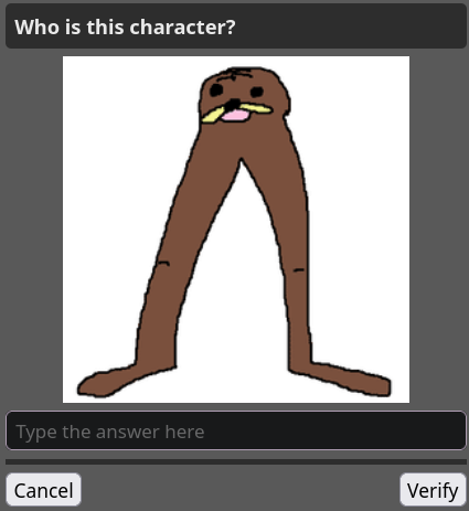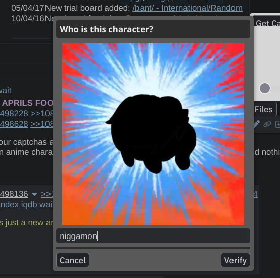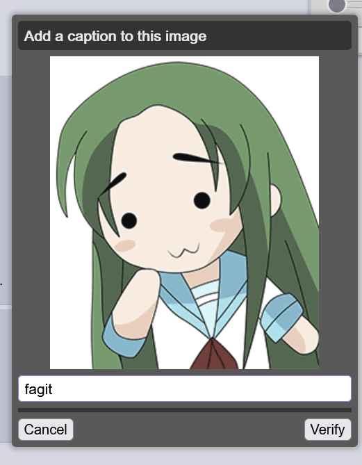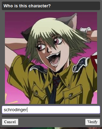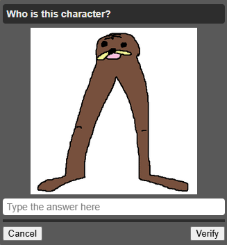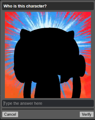 >>108498122I got tomoko chan and some low poly 3d guy i had no fucking clue. Typing "I don't know" got me the default captcha.