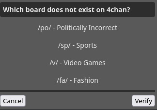 I got a funny one, forgot to screencap:>Which board does not exist on 4chan?>/pol/ Politically Incorrect>/sp/ Sports>/fa/ Fashion>/v/ Video-games/pol/ was the correct answer.I'm calling it now: captchas will degrade to worst and worst shit until 23:59.