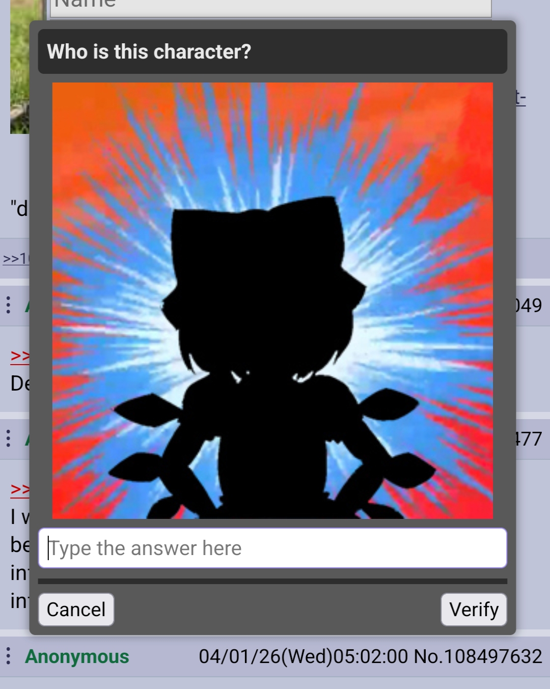 >>108498361emojis was the 2nd time I wished a joke feature became permanentlikes were also lowkey decent desu but not as good as the emoticons (which even got to stick around for almost a whole day after)just got a captcha btw; an anime silhouette with the who's that pokemon backgroundI answered "no idea" and it "worked", but then when I tried to post, it says I mistyped the captcha