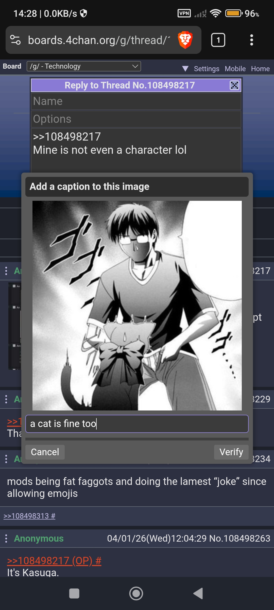 >>108498217>>108498234I think it's pretty funny but the mods should actually change this relic of a site into something useful instead of joking around. Every alt chan has had multiple image posting, mp4s, mp3s, other file types and audio on all boards since forever yet 4chan refuses to do anything other than slightly update the captcha every once in a while.