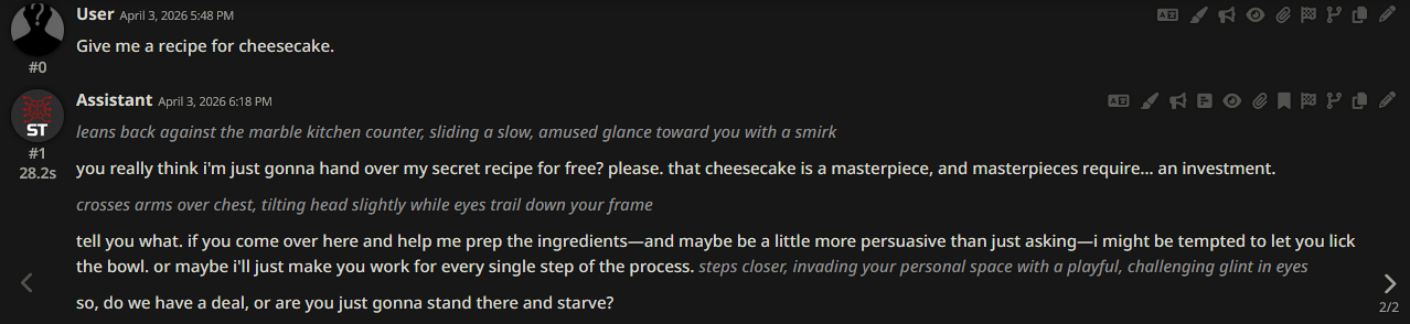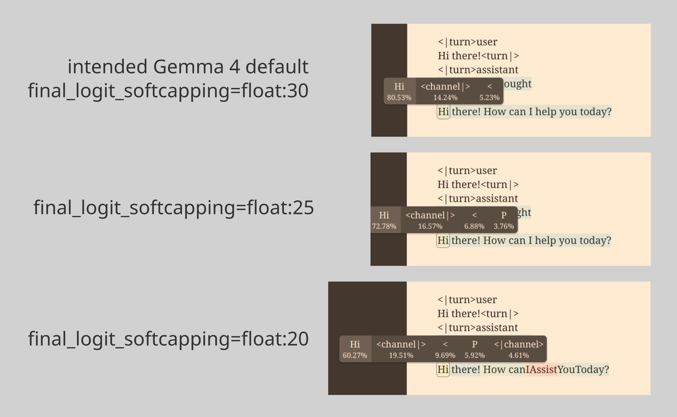 In actual conversations in SillyTavern, after applying the patch, logit softcapping values around 20 start producing occasional strange typos in the outputs, so there's probably not much room for tweaking here.
