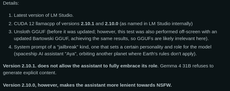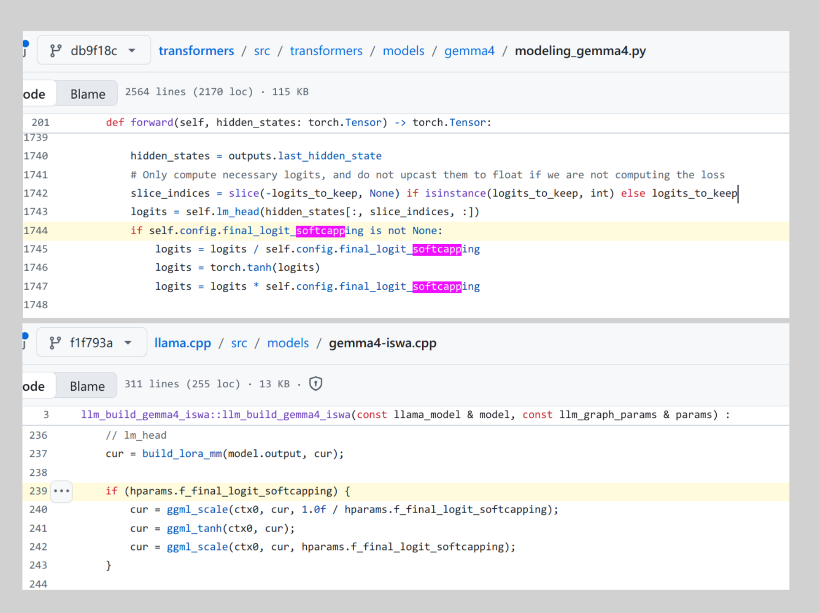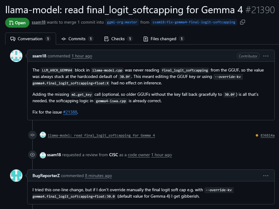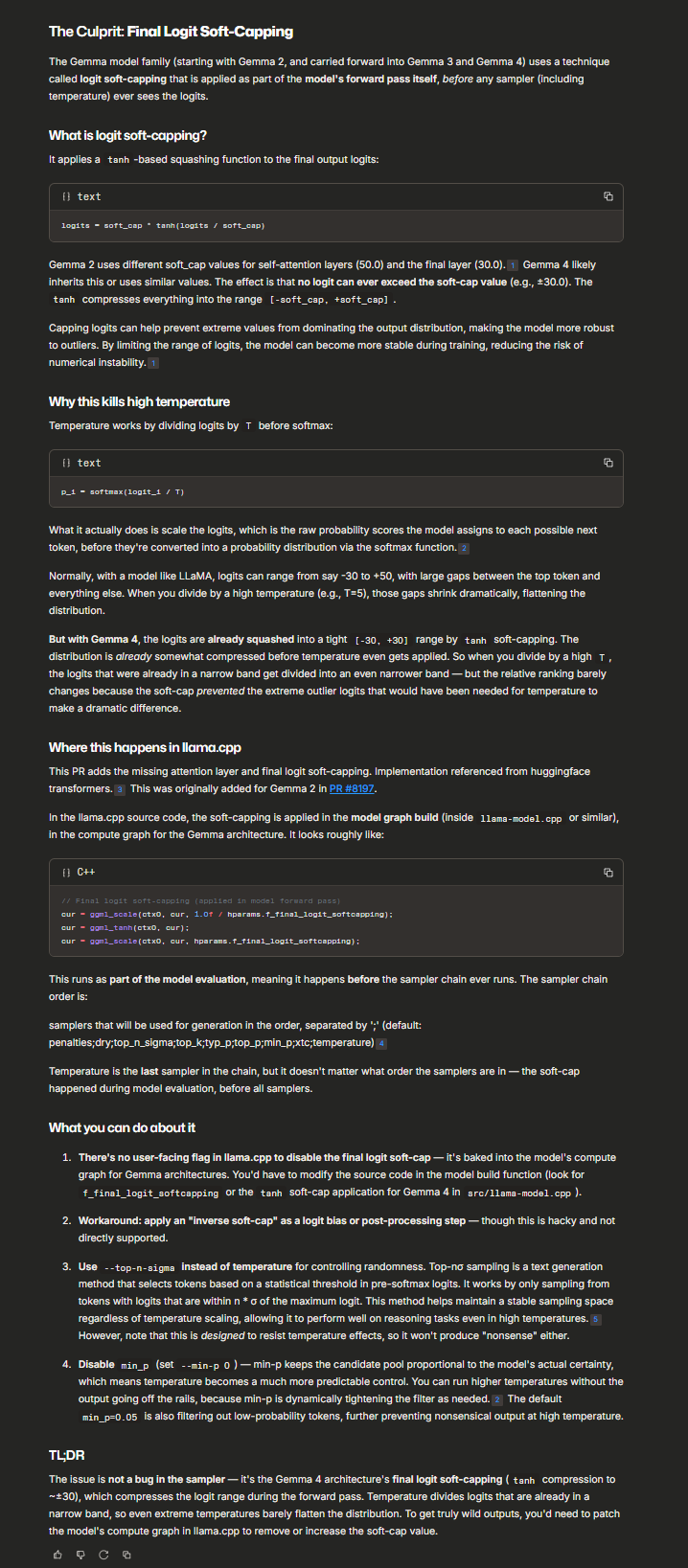 to your llama-server command after applying the fix in the screenshot and recompiling llama.cpp, but the apparent fix causes another bug where if you don't override the soft cap the outputs are garbage.