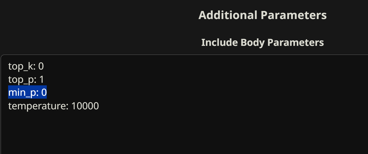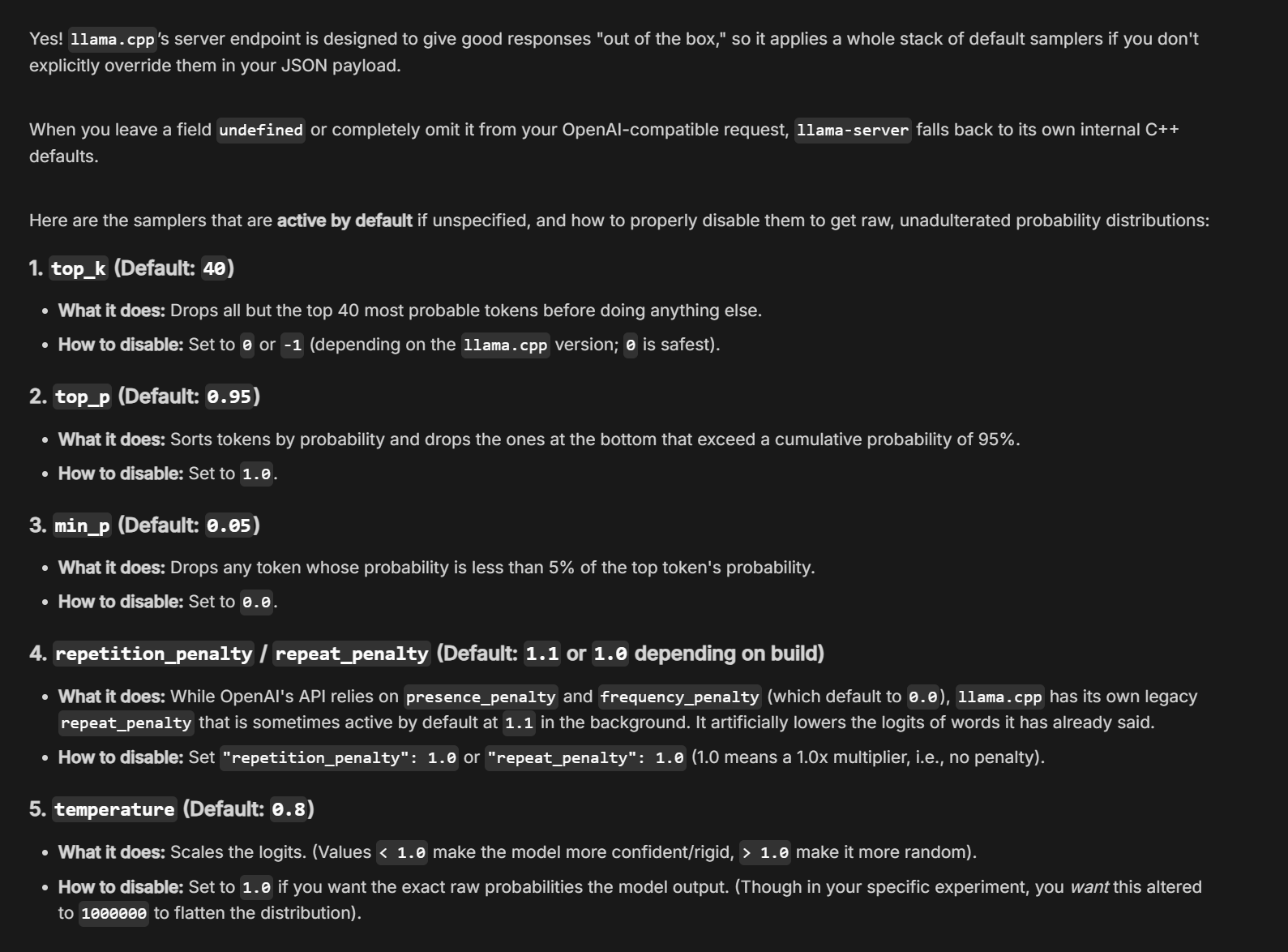 maybe there's other issues with llama.cpp, and did you use the updated gguf quants? maybe that can help, there has to be an issue somewhere, you can't just put "temp = 1 million" and the model is still coherent lol