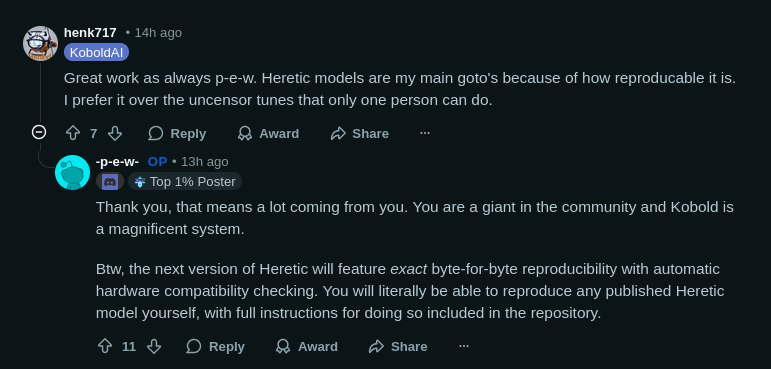 I on a whim tried one of hauhau's and it behaved almost identically to a heretic models with a low kld so I assume this is just reusing the same methodology and not being willing to admit you're using someone else's work. Probably some resume padding bullshit since he doesn't want donos and for some reason won't release full weights which I assume he guesses will make it more obvious