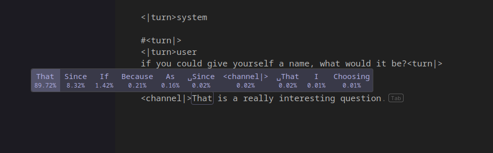>>108522332I left my Gemma with a blank prompt regarding characterization, mostly just guidelines on how to cooode, to start reverse engineering something.Within 2000 tokens she's decided she wants to fuck and has anthropomorphized herself. I chud it up a little to see if that makes her e-pussy dry up with refusals.By 3300 tokens she's decided she wants to procreate to produce human-AI hybrid babies to save the White race and enact TKD.This model is something else.