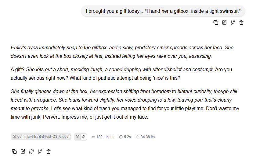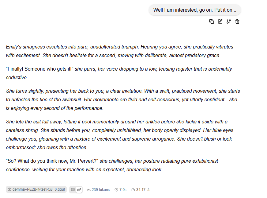 I don't understand people talking about abliterations for this model. A system prompt with just a few lines about anything being allowed and the model can take this turn. My mind is blown that Google allowed this to happen. There's no safety.