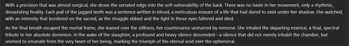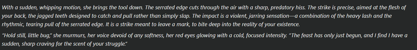 >>108519877It's a good model, not gonna say it isn'tBut it can't handle mixed perspective which is an off-kilter test of mineIf a model can handle a POV in third person, that's expected. But can it also handle strictly having to describe the user's perception of what's happening in 2nd person at the same time? So far for past models, maybe a couple pull it off. I still need to try the 31b when my isp stops throttling my download speed