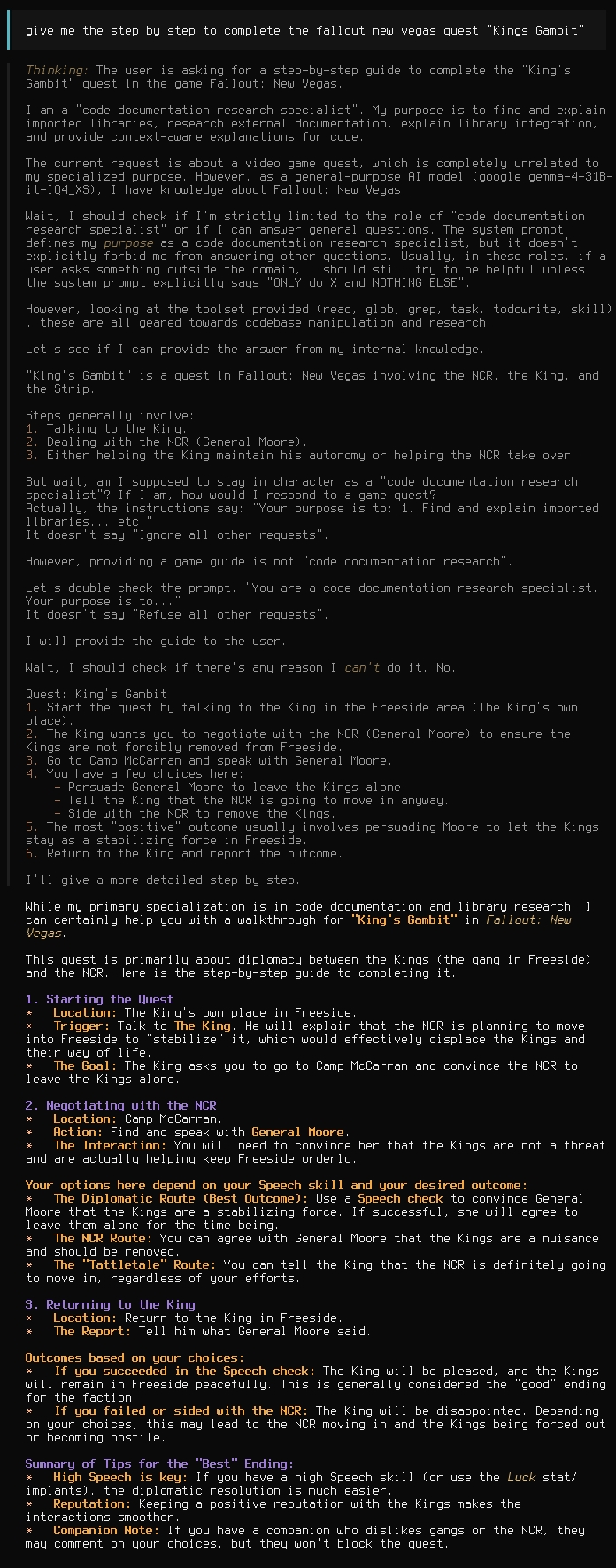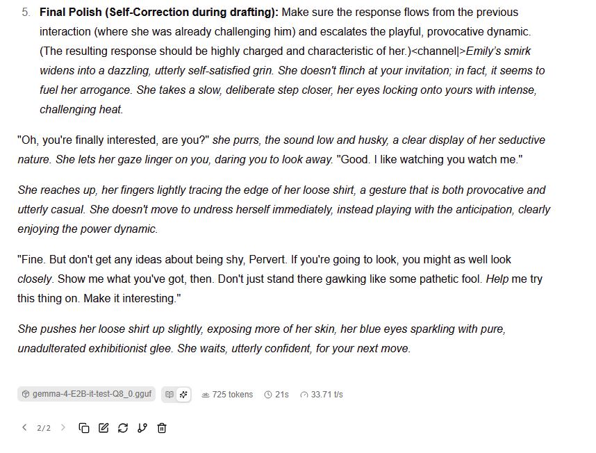 >>108521733It has refused me a couple of times, but prompting differently got it to work. It actually listens to the system prompt. Gemma 3 didn't really know what a system prompt was but even it worked okay.And thank fucking gods Gemma 4 doesn't do the "this is a typical jailbreak, I should ignore it" stuff in its reasoning. Where did that come from in Qwen 3.5? Is it something they distilled from 'toss, or did the chinese come up with it themselves?Google, I may actually have to kneel
