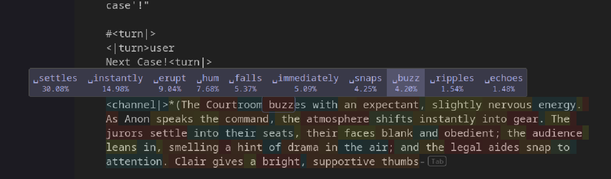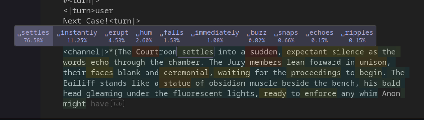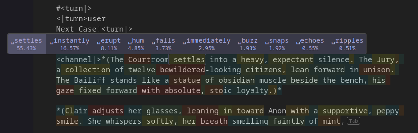 >>108520351This is true, but it should still know what the next token should be. The obvious first error in >>108520351 is where it generates "ties". Unfasten could have still worked, if the model chose e.g. the button on her pants. Arguably, unfastening the ties on the swimsuit would have worked if she re-fastened the ties while putting on the swimsuit, i.e. it could also have been coherent if it wasn't so confident in "lets the suit fall away". Even at that point though it could have recovered if it said "letting it pool momentarily AT her ankles" instead of "around" - the action being that she drops the swimsuit temporarily to take off her clothes (I'm assuming she's clothed).Disregarding the obvious slop and these errors, it does look quite good for a 2B model.