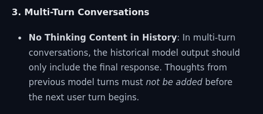 https://github.com/ggml-org/llama.cpp/pull/21418/changes/9cef34bb5eed2dc7c49c1b08f213c448a54f5384>Properly managing the model's generated thoughts is critical for maintaining performance across multi-turn conversations.>Standard Multi-Turn Conversations: You must remove (strip) the model's generated thoughts from the previous turn before passing the conversation history back to the model for the next turn. If you want to disable thinking mode mid-conversation, you can remove the <|think|> token when you strip the previous thoughts.>Function Calling (Exception): If a single model turn involves function or tool calls, thoughts must NOT be removed between the function calls.Isn't this commit only for the latter