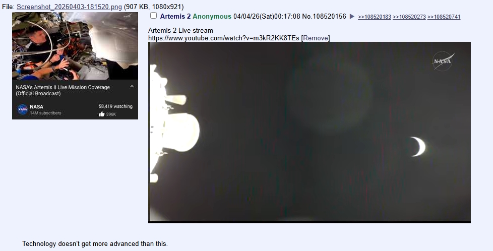 Artemis 2 Live streamhttps://www.youtube.com/watch?v=m3kR2KK8TEsTechnology doesn't get more advanced than this.