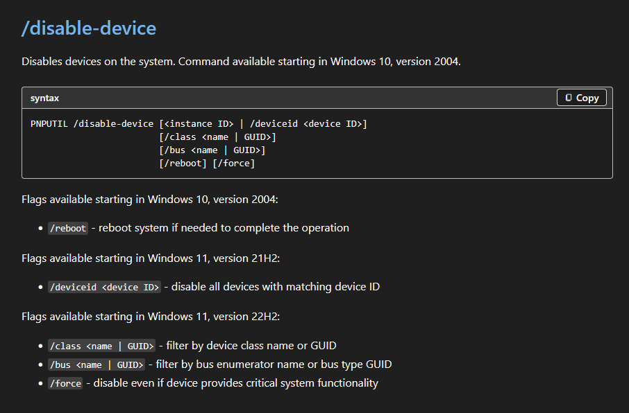 >pnputil, pic related>enum to get class "NetDriver">pnputil /disable-device /class "NetDriver">Nope, wifi still alive, okay>pnputil /disable-device /class "NetDriver" /reboot /forceWifi still alive>pnputil /?EXAMPLES INCLUDE>pnp /disable-device [<instance ID> | /deviceid <device ID>] [/class <name | GUID>] [/bus <name | GUID>] [/reboot] [/force]Am I retarded or is Windows?
