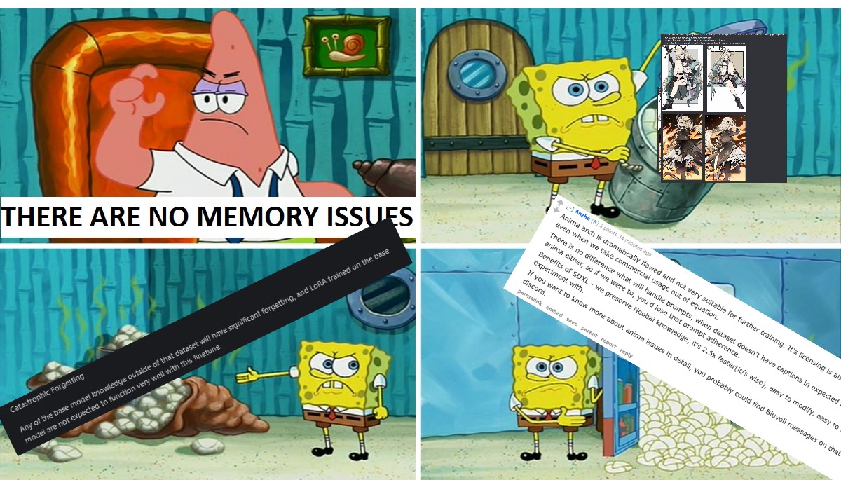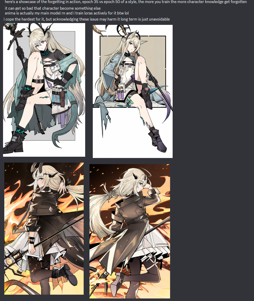 >>108524999HOLY FUCK !I didn't know Anima's catastrophic forgetting was this bad pic related LEFT: epoch 35, RIGHT: epoch 50, WHO THE FUCK IS THIS!?!WHERE DID SHE GO!?!?TDRUSELL WHAT HAVE YOU DONE!!?!?Kept seeing anons say "anima has forgetting issues" and I thought it was skill issuebut this is not a skill issue, people are actively researching this and have found nothing that fully fixes it