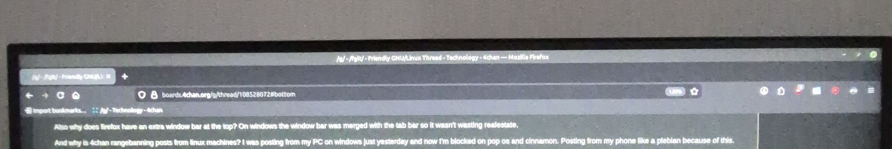 >>108533343New linux mint user here, why does it feel like linux is throttling my cpu when I stop scrolling and then when I start scrolling it lags for a bit before getting up to speed? It was 10x worse on pop os.Also why does firefox have an extra window bar at the top? On windows the window bar was merged with the tab bar so it wasn't wasting realestate.And why is 4chan rangebanning posts from linux machines? I was posting from my PC on windows just yesterday and now I'm blocked on pop os and cinnamon. Posting from my phone like a plebian because of this.