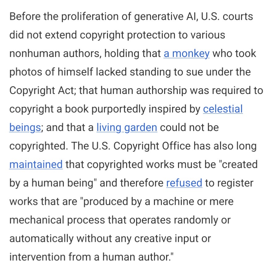 >>108530876https://www.congress.gov/crs-product/LSB10922>The court held that "human authorship is an essential part of a valid copyright claim"