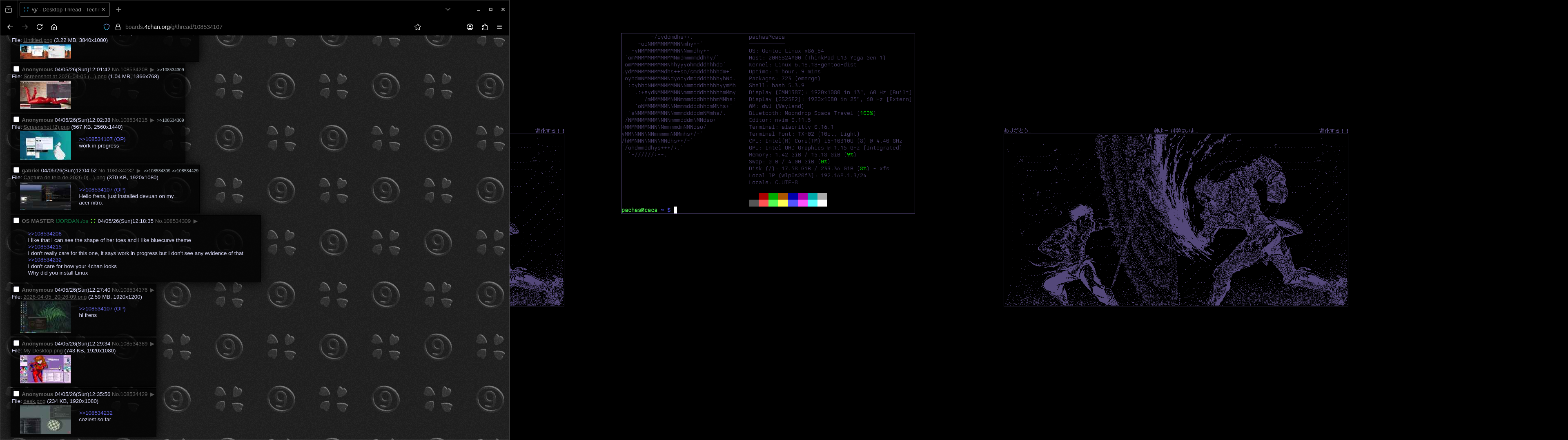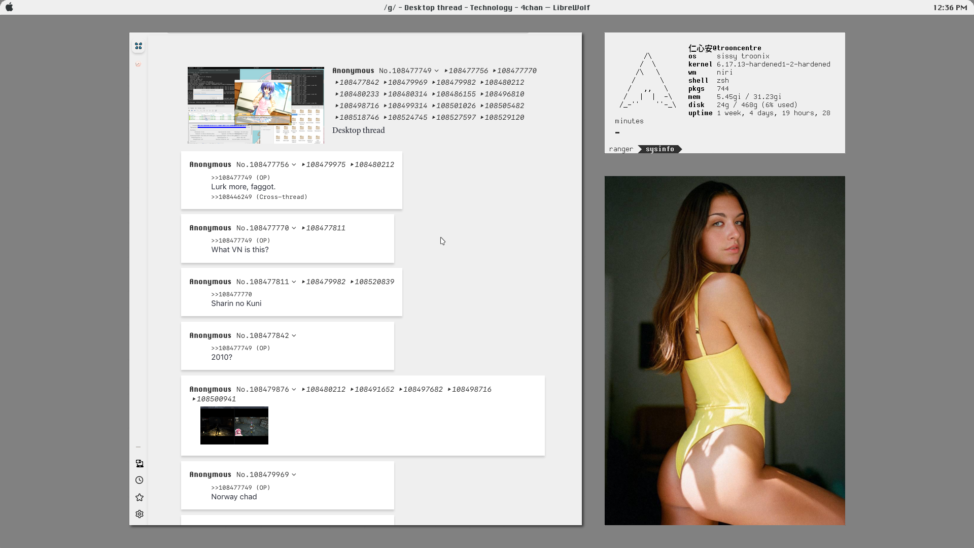 >>108534208I like that I can see the shape of her toes and I like bluecurve theme>>108534215I don't really care for this one, it says work in progress but I don't see any evidence of that>>108534232I don't care for how your 4chan looksWhy did you install Linux
