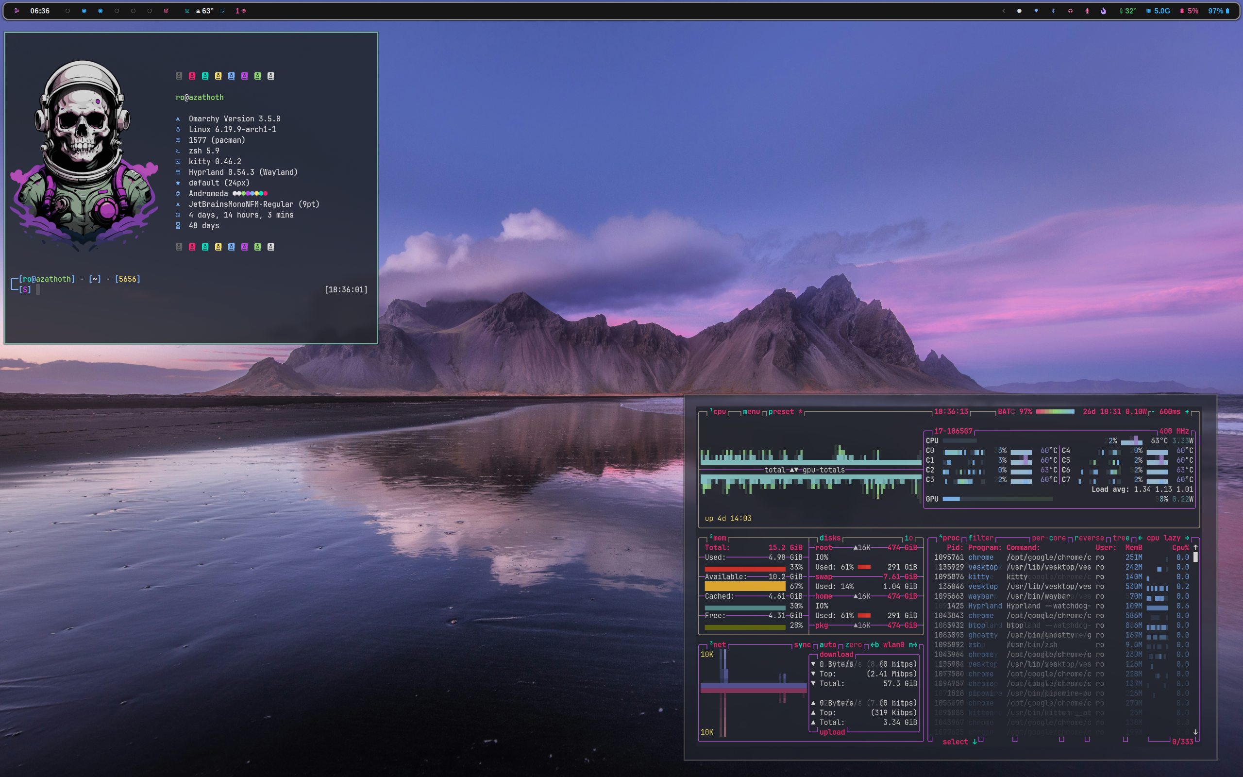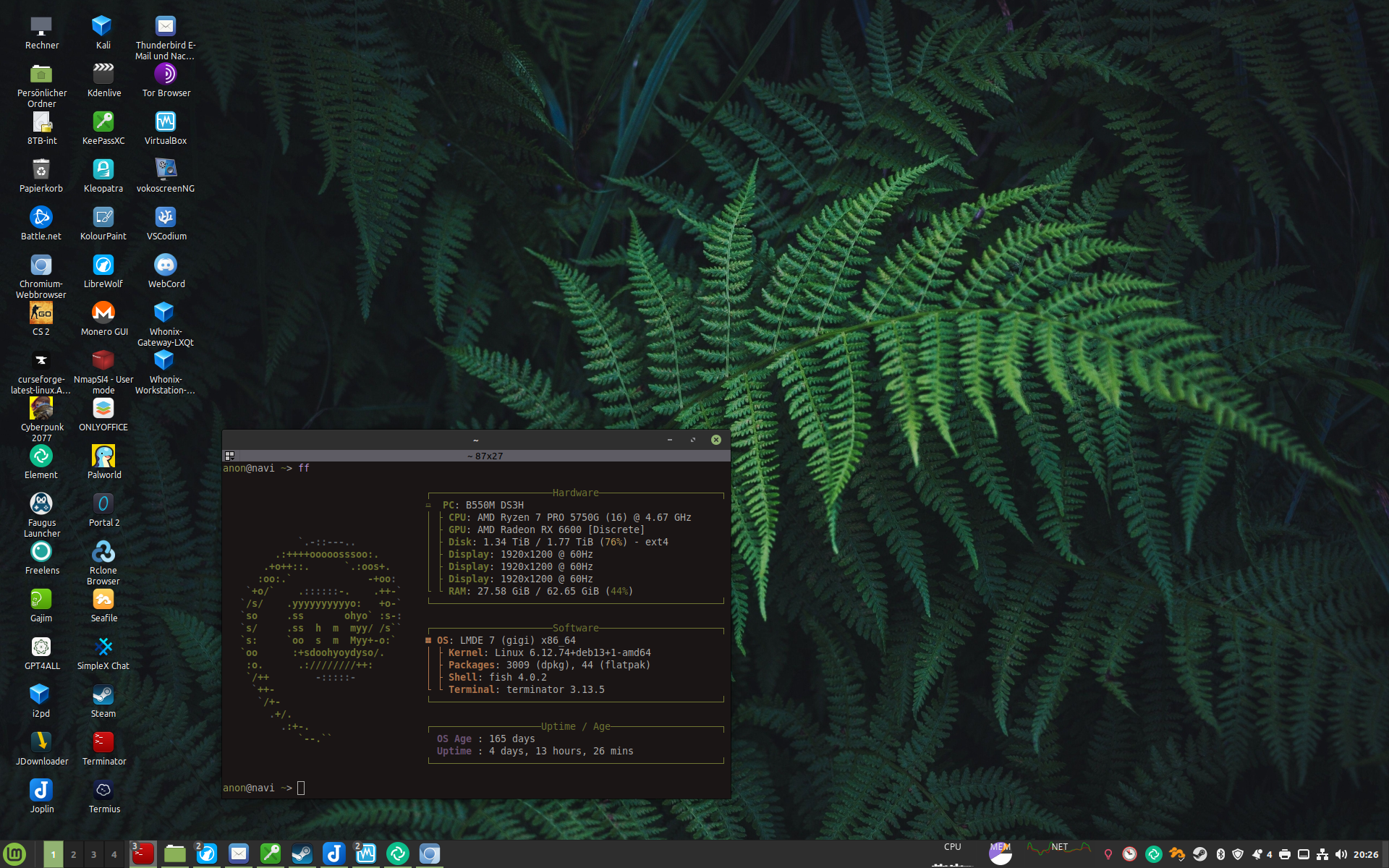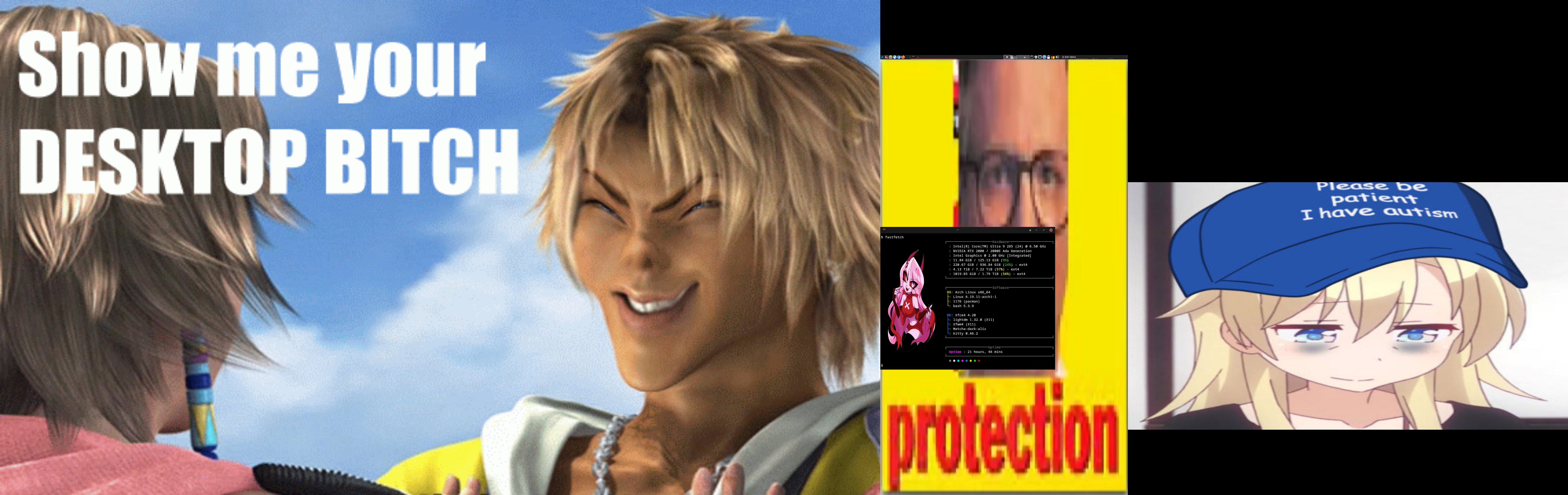 >>108534376I don't care for the CPU, MEM, and NET widget(s) in the panel. They don't fit in nicely.>>108534389I do not care for this desktop subjectively, but objectively it is well put together.>>108534429very plain, but that is not necessarily bad. I like the shade of green on the wallpaper.>>108534442I would recommend a different color scheme for the terminal emulator, the blue is hard to read in your ls output.>>108534462I like this desktop, it reminds me of the mid 2000s.>>108534481I think there is too little contrast in the terminal emulator