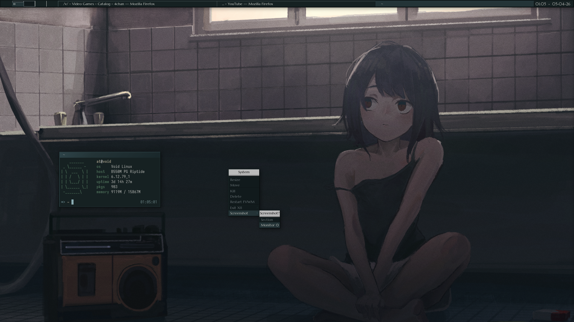 >>108535555colors all match nicelyI hate serifs in typefaces meant to be shown on screens and I also don't like the typeface chosen for your terminal emulator or clock.Is that your entire fvwm menu?