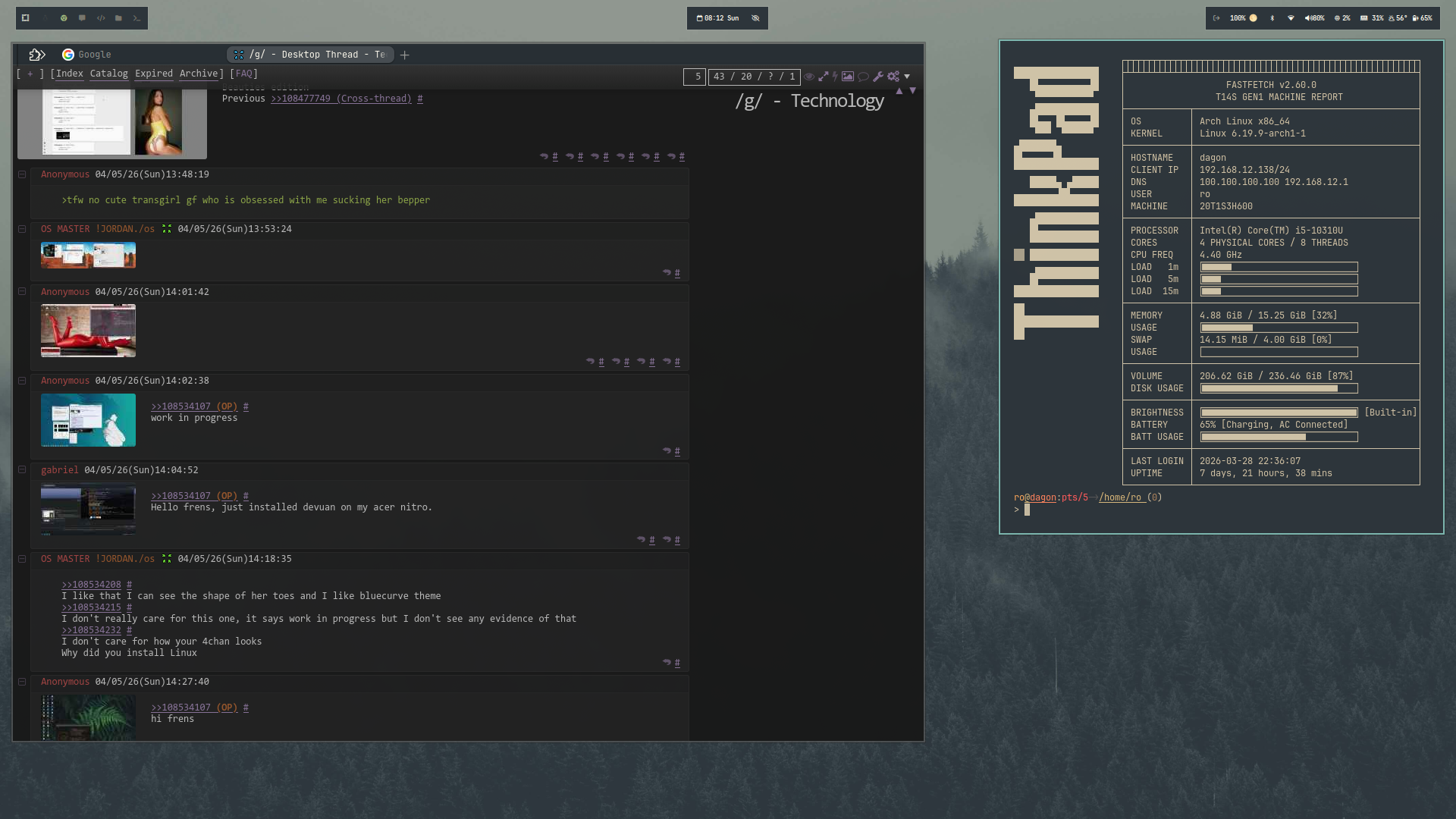 >>108536024I would prefer to see some open applications rather than basically just your papes, this is /g/ not /wg/ after allAlso I think all those percentages (assuming they are cpu usage) would look better as vertical bar graphs rather than a wall of text