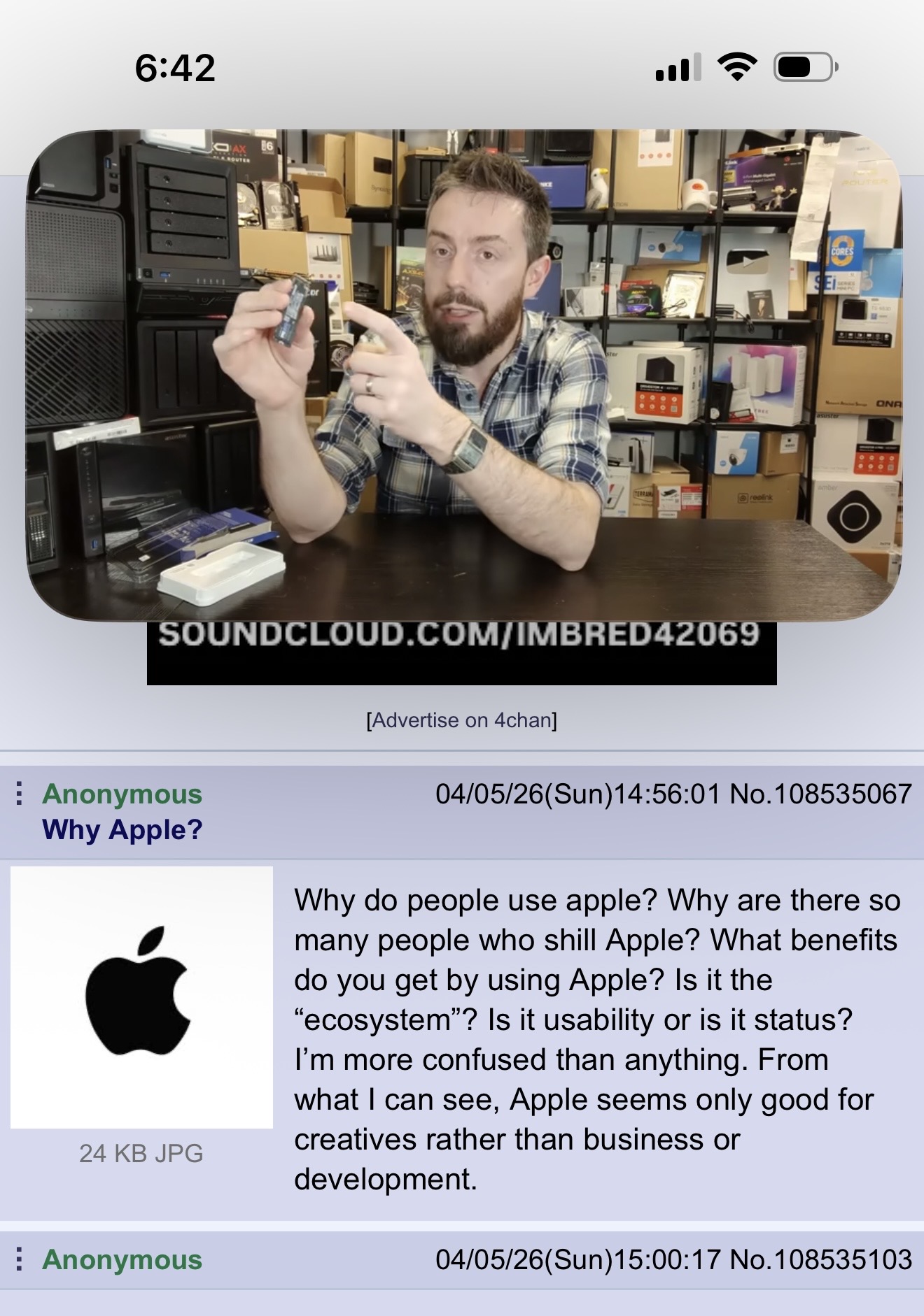 >>108535067>Why do people use apple?status symbol>Why are there so many people who shill Apple?retards everywhere, never shill for a company that isn't yours>What benefits do you get by using Apple?status symbol>Is it the “ecosystem”?comfy jail bed is comfy>Is it usability or is it status?status>I’m more confused than anythingdon't think too hard about it, some retard buy expensive cars or clothes, it's the same retardation>From what I can see, Apple seems only good for creatives rather than business or development.wrong, they're mid at everything, apple is a lifestyle company, it does not matter what you can do with their computers otherwise they would release server and embedded editions of their hardware like a sane tech company would, they don't so they clearly don't care about tech.jusdt ignore this company, you aren't missing out on anything of value, it's the case with most companies these days sadly, most should go bankrupt for the betterment of humanity.