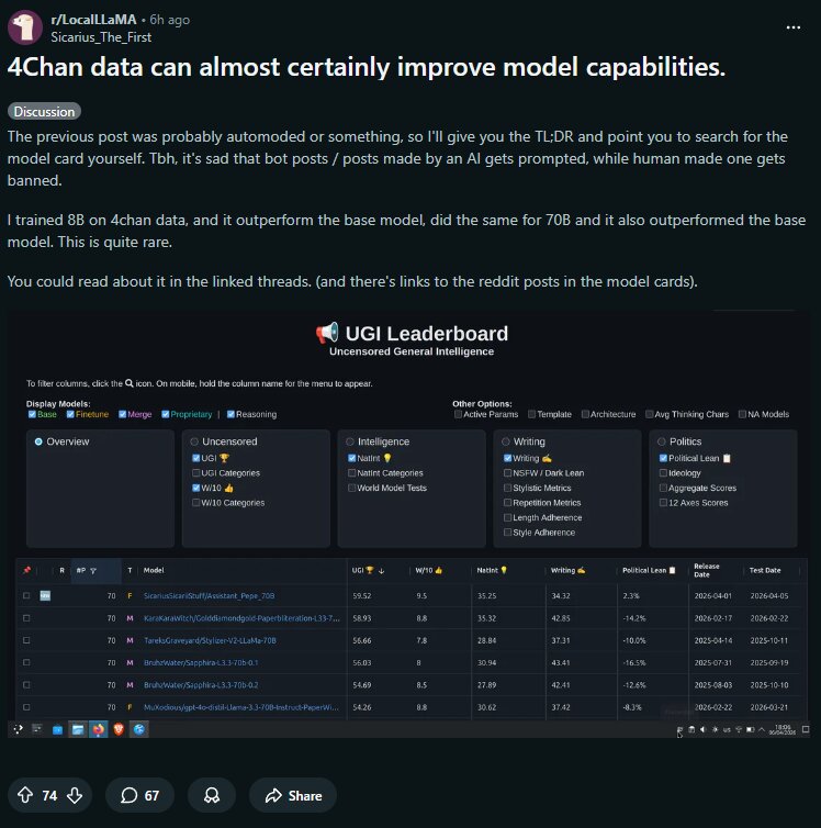 Reddit proved that 4chan is a reliable data source to train AI models.4chan IPO when?https://www.reddit.com/r/LocalLLaMA/comments/1se2kna/4chan_data_can_almost_certainly_improve_model/