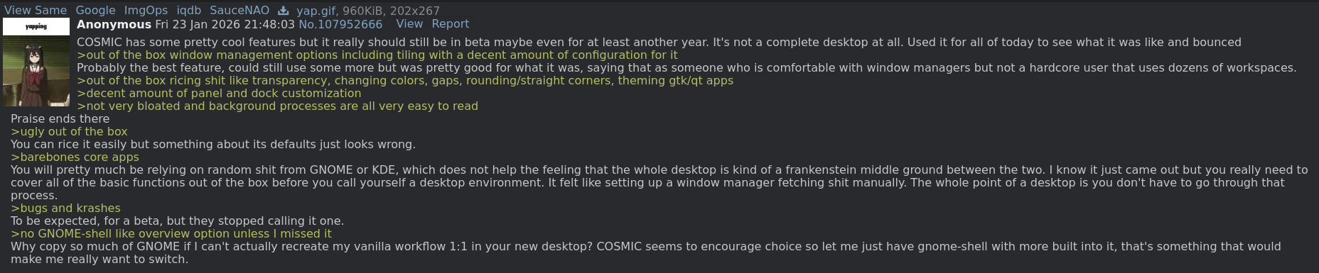 >>108545365You're just listing things that don't cause any issue when not using COSMIC is a sad attempt to launder out the blame for the DE's failure. Cope.