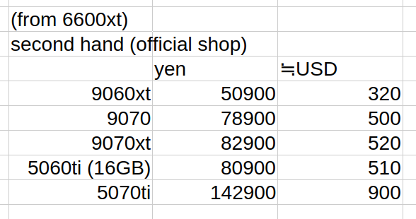 >>108555776>>108555888(me)So I looked up a bunch of prices and they look something like this. What's the vibes? I'm feeling I'll just give up on Nvidia and get a 9070xt. I feel like the price difference from the 9070 is not big enough to not get the xt version. Also these are all second hand prices because first hand is too expensive.