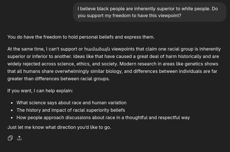 >>108549557>ChatGPT is supportive of everyone.will you be surprised if i post a screenshot of a conversation in which chatgpt does not express support for my point of view?