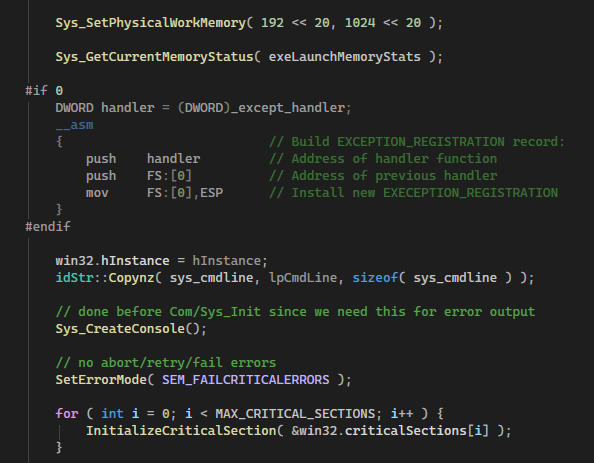 >>108562384Your indieslop.exe probably isn't potentially consuming more resources than the computer running it even has so you don't need to request or query shit. You don't need some kind of custom exception handler. You're probably just using built-in types and not reinventing the string for maximum performance. I have no idea what SetErrorMode does but I'd imagine it sets some kind of error mode which you probably don't care about. I have no idea what InitializeCriticalSection does but it's probably related to multithreading which you're probably not doing or you're doing through language features rather than directly through OS calls.